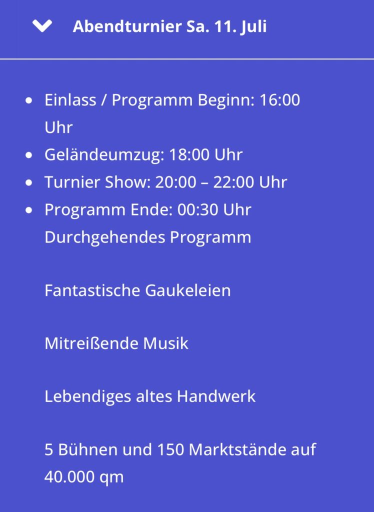 Lass Dich entführen…… in eine fantastische Welt. Mit viel Liebe wird auf Schloss Kaltenberg ein Mittelalterfest inszeniert, das mit Musik, Handwerk und Gaukelei zum Mitmachen, Schauen und Staunen einlädt. Die Krönung des Kaltenberg-Erlebnisses ist die große Ritterturnier-Show. Waghalsige Reiter stürmen die Arena, Feuer, Licht und Musik lassen alle Sinne beben. Eine Liveshow der Extraklasse. (Zitat aus der Homepage des Veranstalters https://www.ritterturnier.de/ )